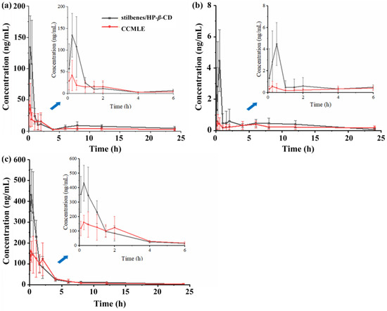 Mean plasma concentration–time profiles of cajaninstilbene acid (CSA) (a), longistyle C (LLC) (b) and 4-O-methylpinosylvic acid (MPA) (c) in rats following oral administration of Cajanus cajan (L.) Millsp. leaf extract (CCMLE) (red) and stilbene/HP-β-CD inclusion complex (black) over 24 h (n = 6, mean ± SD). Insets show detailed concentration changes within first 6 h.