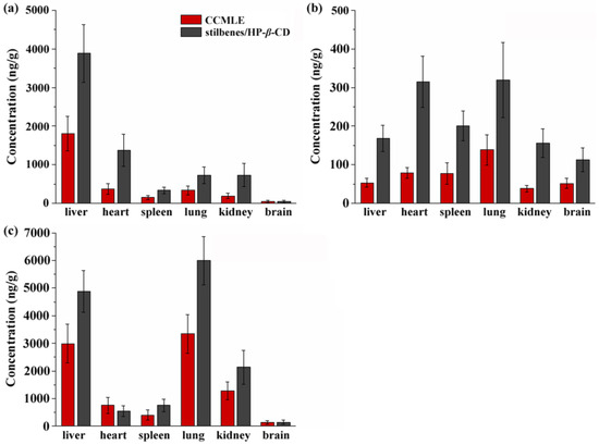 The tissue distribution profiles of the three stilbenes following the oral administration of either CCMLE or the stilbene/HP-β-CD inclusion complex were assessed in different rat tissues. As shown in Figure 7, all three of these compounds were detectable in the heart, liver, spleen, lungs and kidneys and brains, indicating a broad systemic distribution.