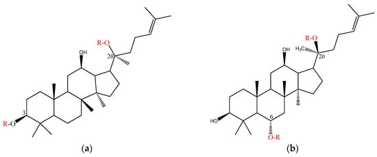Chemical structures of ginsenosides. (a) Protopanaxadiol (PPD); (b) protopanaxatriol (PPT); (c) ocotillol type; (PPD); (d) oleanolic acid type.