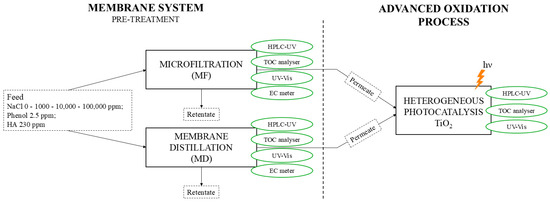 Schematic representation of the experimental setup used in this study. The treatment system consists of two alternative membrane-based pre-treatment processes (microfiltration, MF, or membrane distillation, MD) applied to a synthetic PW feed. The permeate obtained from each membrane process was subjected to the subsequent advanced oxidation process (AOP), which involved heterogeneous photocatalysis using TiO2 under UV irradiation. The retentate was not subjected to any treatment. Water quality parameters were monitored at different stages using HPLC-UV, TOC analyser, UV–Vis spectrophotometer, and conductivity meter (EC).