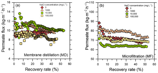 Figure 2 presents the experimental permeate flux obtained in MD (1a) and MF (1b) tests with synthetic PWs characterized by different NaCl concentrations (0, 1000, 10,000, and 100,000 mg L−1), as a function of the recovery rate. In MD the presence of salts and organic compounds may negatively affect the process, possibly causing fouling (deposition of material on the membrane surface and blocking of pores), wetting, and/or scaling (formation of salt crystals on the membrane) [23,24,25,26,27,28].