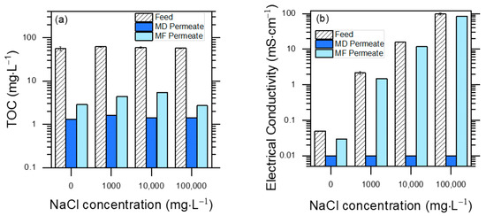 Separation performance measured with membrane-based pre-treatment filtrations, with different synthetic PW solutions. Note the logarithmic scales on both Y axes, due to very high differences in TOC values between feed and permeates, and in electrical conductivity among different feeds. (a) TOC values of feed and permeate solutions for both MD and MF treatments. Feed TOC variability is an index of reproducibility of measurements (TOCo = 58 ± 6 mg L−1 (μ ± σ)). (b) Conductivity of feed and permeate solutions for both MD and MF treatments. Conductivity values varied from 10 to over 100,000 μS cm−1.