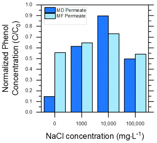 Finally, Figure 4 shows membrane pre-treatment performance towards the elimination of phenol. Phenol rejection was far from quantitative in either case, and it was always ≤50% in the presence of NaCl. In the case of MF, the membrane pores were too large to remove phenol; thus, any degree of phenol rejection was unexpected. Interestingly, MF even produced a slightly higher phenol removal than MD in the case of PW 10,000. This result could be explained by the fact that phenol can interact with humic acids, especially when the ionic strength of the solution is high [35]. Under such circumstances, phenol–humic acids aggregates could be retained by the MF pores. Differently from PW 0, in the other PWs, the presence of NaCl likely induced a salting-out effect that increased phenol volatility and accounted for quite low phenol rejection by MD in the most saline solutions (e.g., ~10% for PW 10,000).