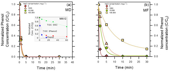 Overall, the pre-treatment via membrane distillation (MD) or microfiltration (MF) followed by TiO2 photocatalysis demonstrated satisfactory performances, achieving phenol degradation ratios of up to >99% within just 5 min of treatment, with a minimum of 80% degradation after 30 min of irradiation under the highest concentration of NaCl (100,000 mg L−1), in the case of MF pre-treatment. These results are comparable with similar works, highlighting that the use of membrane-based pre-treatment can avoid the use of sophisticated photocatalysts [3,45,46]. The obtained phenol removal rate is also similar to results obtained in low-salinity water matrices, such as drinking water: Valadez-Rentevria et al. (2021) employed CuS/TiO2 nanoparticles in drinking water and obtained ~90% degradation of chlorophenol (20 mg L−1 initial concentration) after 150 min of irradiation [47]. Andrade et al. (2014) obtained 70% phenol (85 ppm initial concentration) removal after 6 h of UV-visible light exposure, using a composite of TiO2 and copper-loaded nanoporous carbon in a carbon matrix [48]. Similar results could be observed for TiO2 alternatives, such as ZnO. Vasantharaj et al. (2021) reached ~90% of organic dyes (methylene blue and malachite green, 10 mg L−1 initial concentration) degradation after 150 min of sunlight irradiation in wastewater [49]. Lakshmi et al. (2019) reported that La-ZnO-polyacrylonitrile fiber nanocomposites could achieve 98% degradation of atrazine (10 mg L−1 initial concentration), a persistent pesticide, in 60 min [50,51].