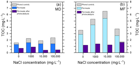 The effects of MD and MF pre-treatments on the TOC values of PW are displayed in Figure 3a (feed: original PW; permeate: membrane-treated PW) for different initial contents of NaCl. Both techniques were effective at removing humic substances, which accounted for >95% of the initial TOC (the rest was accounted for by phenol). MD performed better than MF, achieving 98–99% TOC removal vs. 95–97%.