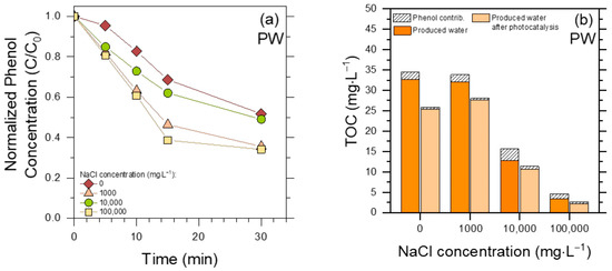 (a) Phenol degradation profiles in raw PW at different initial concentrations of NaCl, upon UV-A irradiation in the presence of 0.5 g L−1 TiO2. (b) TOC removal upon the same photocatalytic treatment of PW (but for 60 min treatment time).