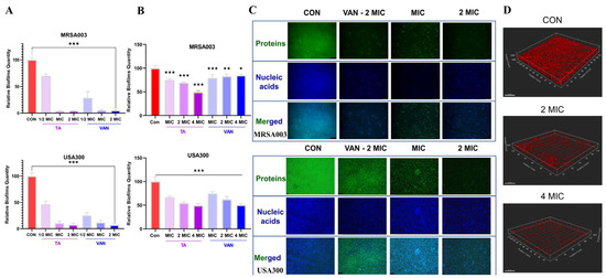 - Qin, N.; Tan, X.J.; Jiao, Y.M.; Liu, L.; Zhao, W.S.; Yang, S.; Jia, A.Q. RNA-Seq-based transcriptome analysis of methicillin-resistant Staphylococcus aureus biofilm inhibition by ursolic acid and resveratrol. Sci. Rep. 2014, 4, 5467. [Google Scholar] [CrossRef]