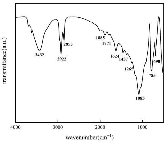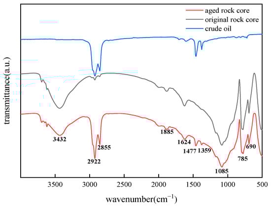 The wettability alteration mechanism of oil-wet core surfaces and the adsorption behavior of BS-12 on these surfaces were investigated using FT-IR, as shown in Figure 1 and Figure 2. The spectrum of the aged oil-wet cores reveals characteristic peaks at 690 and 785 cm−1 (Si-O bending and stretching), 1085 cm−1 (asymmetric Si-O stretching), and 3432 cm−1 (O-H stretching), which align with the spectrum of the original rock core. Additionally, new absorption peaks are observed at 2855 and 2922 cm−1 (C-H stretching of alkyl chains -CH3 and -CH2) and 1359 cm−1 (C=O stretching), corresponding to those seen in the crude oil spectrum. These findings confirm the adsorption of oil components on the rock surfaces.