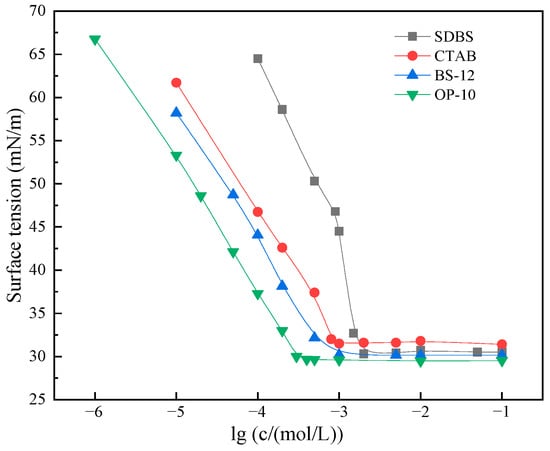 Surface tension measurements of surfactant solutions at varying concentrations were conducted using the Wilhelmy plate method. A γ/lg c curve was constructed to identify the critical micelle concentration (CMC). In addition, the Gibbs adsorption equation was utilized to determine the maximum surface adsorption (Γmax), the minimum molecular cross-sectional area (Amin), and the surface adsorption efficiency (pC20) [37,38,39].