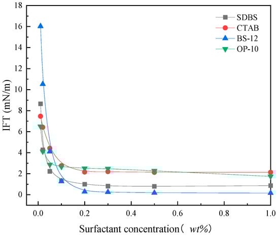 Figure 4 presents the interfacial tension (IFT) variation between crude oil and four emulsifiers as a function of concentration. The IFT decreases with increasing emulsifier concentration, reaching a plateau beyond a certain threshold. Both the anionic surfactant SDBS and the zwitterionic surfactant BS-12 reduce the IFT to the order of 10−1 mN·m−1. The study of Sun et al. [25] indicated that betaine had generally high interfacial film strength with crude oil, at this time, the slight difference in film strength had a negligible effect on enhancing recovery. The main contributing factor was the difference in interfacial tension between the oil and water. Ultralow IFT could increase the stripping efficiency of oil in the pores and reduce the energy required for emulsification or the initiation of oil droplets. Betaine-type surfactants [26] synergize with crude oil’s native active components to reduce IFT to ultralow levels. The optimal spatial arrangement of hydrophobic chains facilitates co-adsorption with crude oil surfactants at the interface, forming densely packed interfacial films that trigger abrupt declines in dynamic IFT measurements.