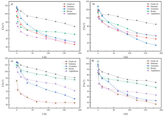 Contact angle variation curve of surfactant solution (0.05 wt%) on surface of rock cores adsorbing different crude oils and their components: (a) SDB; (b) CTAB; (c) BS-12; (d) OP-10.