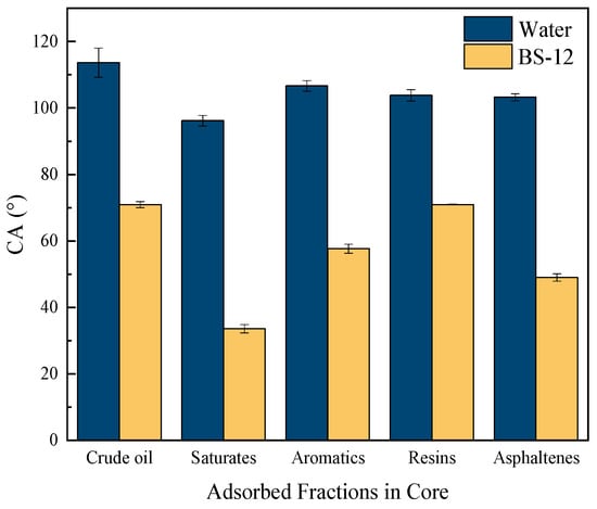 As illustrated in Figure 6, the contact angles of all surfactants decreased markedly with increasing contact time, demonstrating rapid spreading behavior followed by stabilization after approximately 2 min. This behavior suggests that the wetting process involves two distinct stages: a rapid adsorption phase of the surfactant followed by the establishment of equilibrium. This phenomenon is attributed to the dynamic adsorption of surfactant molecules at the solid–liquid interface, where molecular rearrangement leads to the formation of a bilayer adsorption structure. The hydrophobic tails interact with crude oil fractions, while the hydrophilic headgroups orient outward, resulting in a gradual reduction in contact angles. This interfacial reorganization also modifies other surface properties, including surface charge characteristics, microscopic adsorption morphology, and the distribution of chemical functional groups [29]. Figure 7 indicates that, compared to pure water, the BS-12 solution significantly enhances the surface hydrophilicity of cores adsorbed with various fractions, with a particularly pronounced wettability reversal observed on aromatic and asphaltene-coated surfaces (which are initially strongly oil-wet). BS-12 exhibits rapid spreading on oil-wet core surfaces, facilitating its effective action along the pore channel surfaces of formation cores, thereby significantly improving the unblocking performance of the surfactant system.