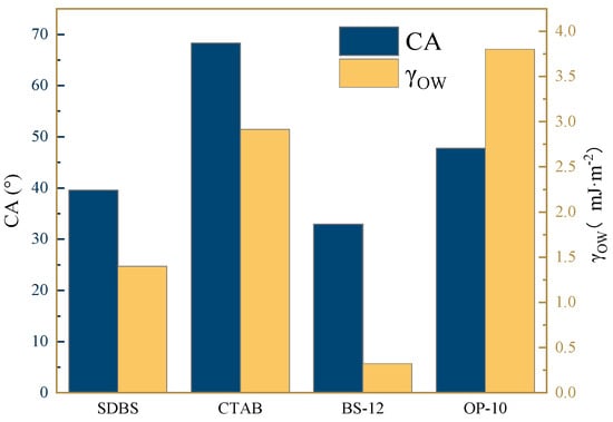 Adhesion work (WOS) can be calculated based on Young’s equation by incorporating the oil–water interfacial tension (γOW) and the contact angle (θ) in the oil–water–solid three-phase system [31]: