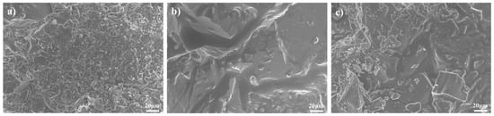 To investigate the interfacial interactions between emulsifier solutions, rock substrates, and crude oil, SEM was utilized to compare three different core surface conditions: untreated original cores, aged cores with crude oil adsorption, and emulsifier-treated cores. The representative microstructural characteristics are shown in Figure 9.