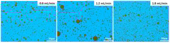 The migration of crude oil through reservoir porous media often occurs in the form of emulsions, the characteristics of which are determined by their interfacial properties. These emulsion characteristics, such as droplet size distribution, emulsified oil content, and stability, all of which are indicators of interfacial behavior, play a crucial role in influencing seepage dynamics and ultimate recovery efficiency. Importantly, the compatibility between the size of emulsion droplets and the diameter of the reservoir pore throats directly affects the mobility of crude oil. A comprehensive study of the interactions between emulsion characteristics and seepage behavior forms the theoretical basis for optimizing emulsion flooding techniques, thus enhancing oil recovery performance. Figure 10 shows the microscopic images of emulsions under different flow rates, while Figure 11 presents the corresponding particle size distribution.