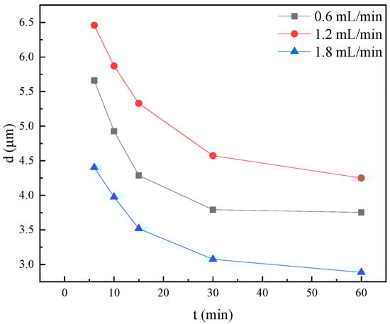 As shown in Figure 11, the emulsion droplet size significantly decreased within the first 30 min of outflow, after which the size distribution gradually stabilized, reaching a steady state with minimal variation by 60 min. Droplet size reduction occurred at flow rates both below and above 1.2 mL/min, with a more pronounced decrease at higher flow rates, as clearly illustrated in the corresponding microscopic images (Figure 10). This variation in size is likely due to changes in interfacial wettability and macrochannel plugging [33]. The effectiveness of surfactant-induced wettability alteration is strongly time-dependent, as demonstrated by the evolution of the contact angle: a rapid initial decrease followed by an asymptotic approach to equilibrium. Low-flow conditions provide sufficient time for both complete wettability reversal and enhancement in interfacial activity through surfactant rearrangement, consistent with the findings of Ahmadi-Falavarjan et al. [34].