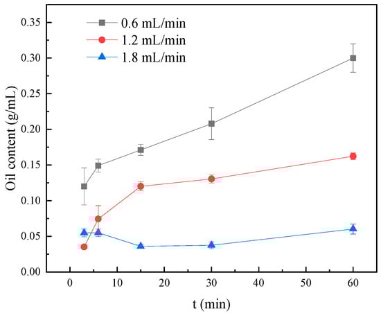 Flow velocity significantly affects the emulsified oil content within porous media, with higher flow rates leading to a reduction in oil emulsification. As shown in Figure 12, at a flow rate of 1.8 mL/min, the oil content remained below 0.06 g/mL throughout the entire experiment. In contrast, at 1.2 mL/min, the oil content gradually increased over time, reaching 0.16 g/mL after 60 min. The highest oil content was observed at the low flow rate of 0.6 mL/min, which can be attributed to the slower expansion of fluid sweep efficiency under reduced flow conditions. Furthermore, the restricted mobility of oil droplets through narrow pore throats promotes phase separation, where the aqueous phase preferentially flows through narrow channels with longer residence times, resulting in increased water retention within the porous matrix. Consequently, the produced fluid exhibits a lower water cut and a corresponding increase in oil content [36].
