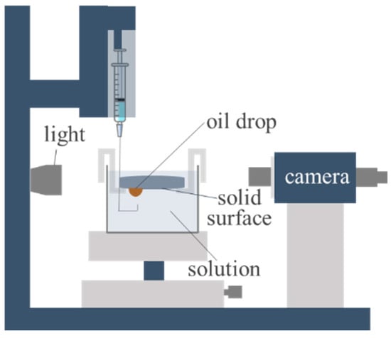 The wettability of the prepared core surfaces was characterized using a contact angle goniometer. Static contact angles were determined at three randomly selected points on each core surface by the sessile drop method, employing 2.5 μL liquid droplets. Considering the lower density of oil relative to aqueous solutions, the inverted pendant drop technique was used to determine the oil–water–solid three-phase contact angles, as depicted in Figure 13.