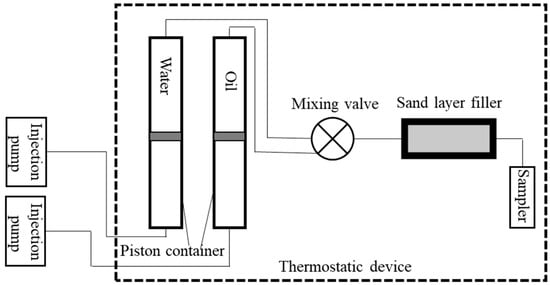 The core flooding experimental setup was constructed as shown in Figure 14. Approximately 80 g of Gudao heavy oil was loaded into the oil tank, while the displacing fluid (0.2 wt% BS-12 solution) was introduced into the water tank. The pump was calibrated to maintain consistent flow rates (0.6~1.8 mL/min) and oil-to-water ratios (1:5) through the core holder. The experiment was conducted at a controlled temperature of 40 °C. Effluent emulsions were collected at various time intervals for subsequent analysis, including oil content determination. A microscopic examination was conducted to observe and record the size and morphology of the emulsion droplets. The microscopic images were then quantitatively analyzed using the publicly available software Image J (version 1.8.0) to determine the droplet size distribution of the emulsions.
