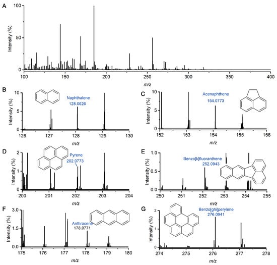 Detection of PAHs mixture in a solution of methylene chloride and methonal (1:1). (A) Full mass spectrum of the solution injected by nanoESI and ionized by the plasma. (B–G) Mass spectra of naphthalene at m/z of 128.0626, acenaphthene at m/z of 154.0733, pyrene at m/z of 202.0773, benzo[k]fluoranthene at m/z 252.0943, anthracence at m/z of 178.0771, and benzo[ghi]perylene at m/z of 276.0941, respectively.