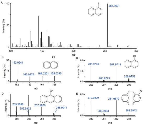 Detection of HPAHs mixture in methanol–methylene chloride solution. (A) Full mass spectrum of the solution injected by nanoESI and ionized by the plasma. The peak at m/z of 253.9601 is identified to be 1-iodonaphthalene. (B–E) Mass spectra of 1-chloronaphthalene, 1-bromonaphthalene, 9-bromoanthracene, and 1-bromopyrene, respectively.