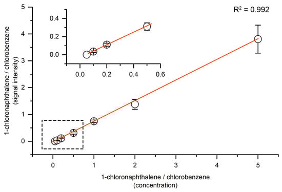 Plot of the signal intensity ratio and concentration ratio of 1-chloronaphthalene/chlorobenzene, showing strong linear behavior. Error bars represent one standard deviation based on three measurements.