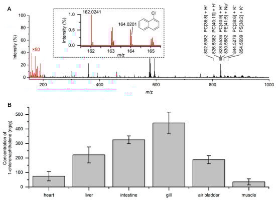 Simultaneous detection of 1-chloronaphthalene and polar lipids in a fish exposed to 1-chloronaphthalene. (A) Typical mass spectrum of the intestine extract from a fish. Zoomed-in spectrum shows the nonpolar peak of 1-chloronaphthalene. (B) Quantification of 1-chloronaphthalene in different organs from the fish.