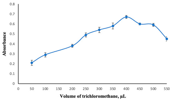 The efficiency of the DLLME process was evaluated using varying volumes of trichloromethane (50 to 550 µL), while keeping the dispersive solvent volume and other conditions constant. Based on the results obtained, 400 µL of trichloromethane was identified as the optimal volume (Figure 2).