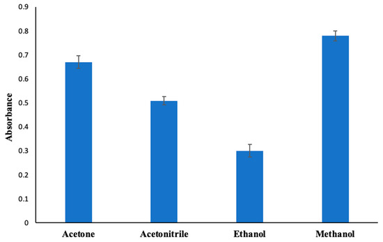 Change in absorbance depending on the extraction solvent. Extraction conditions: sample volume, 10.00 mL; dispersive solvent, 1.50 mL methanol; 350 µL of MAMA-Ni(II)Pc 2 (0.08 mmol/L, acetone); pH, 5.5; centrifugation conditions: 4000 rpm, 5 min. Error bars represent the standard deviation for n = 3.