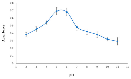 The pH of the aqueous phase has a substantial action in the DLLME process, as this parameter directly influences the formation and extraction of the Co2+-MAMA Ni(II)Pc 2 complex with sufficient hydrophobicity [57]. The extraction efficiencies at various pH levels (2.0–11.0) were examined to determine the optimum pH for the DLLME process. At low pH, the nitrogen atoms located on the peripheral substituents of MAMA-Ni(II)Pc 2 become protonated, thereby reducing the ligand’s coordination ability. At high pH, on the other hand, Co2+ ions tend to precipitate in the form of hydroxide, which also diminishes complex formation. It is evident from Figure 5 that the highest absorbance of Co2+-MAMA Ni(II)Pc 2 was observed between pH 5 and 6. Consequently, pH 5.5 was determined as optimal for subsequent analyses.