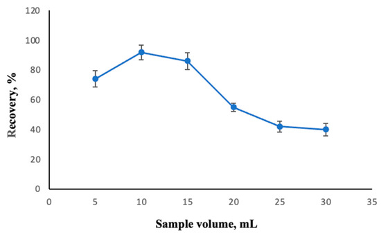 The effect of sample volume on the recovery of Co2+. Extraction conditions: sample volume, 10.00 mL; extraction solvent, 400 μL of trichloromethane; dispersive solvent, 1.50 mL methanol; 350 µL of MAMA-Ni(II)Pc 2 (0.08 mmol/L, acetone); pH, 5.5; centrifugation conditions: 4000 rpm, 5 min. Error bars represent the standard deviation for n = 3.