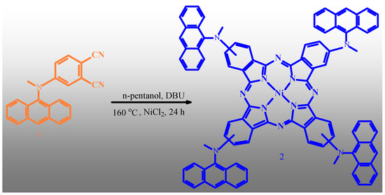 A mixture of 4-[9-anthrylmethyl)amino]phthalonitrile (1) (1.6 g, 4.78 mmol), anhydrous nickel(II) chloride (NiCl2) (154.94 mg, 1.196 mmol), and five drops of DBU was subjected to heating at 160 °C in dry n-pentanol (6 mL) under sealed-tube conditions and stirred for 24 h (Figure 8). After completion of the reaction, the green precipitate was obtained through the addition of ethanol (40 mL) and collected via filtration. For 2 h, the green solid product was refluxed with ethanol (60 mL), filtered off again, and washed with hot ethanol, distilled water, and diethyl ether. Following vacuum drying, the product was subjected to purification via column chromatography over basic alumina, employing chloroform–methanol (94:6, v/v) as the eluent. Yield: 800 mg (45%). Mp > 300 °C. Anal. calc. for C92H60N12Ni FT-IR νmax/cm−1 (KBr pellet): 3078 (Ar-H), 2938–2893 (Aliphatic. C-H), 1600, 1581, 1452, 1438, 1426, 1372, 1353, 1262, 1200, 1150, 10,877, 1039, 964, 946, 912, 839, 803. 1H-NMR (CDCl3), (δ: ppm): 7.36–7.42 (m, 8H, ArH), 7.55–7.61 (m, 16H, ArH), 7.80–7.99 (m, 8H, ArH), 8.05–8.15 (m, 8H, ArH), 8.22–8.35 (m,8H, ArH), 3.38 (s, 12H, H3C-N). UV-Vis (CHCI3): λmax, nm (log ε): 686 (4.96), 625 (4.86), 605 (4.38), 347 (4.88), 328 (5.02). MALDI-TOF-MS, (m/z): calculated: 1392.25; found: 1332.33 [M-4CH3]+.