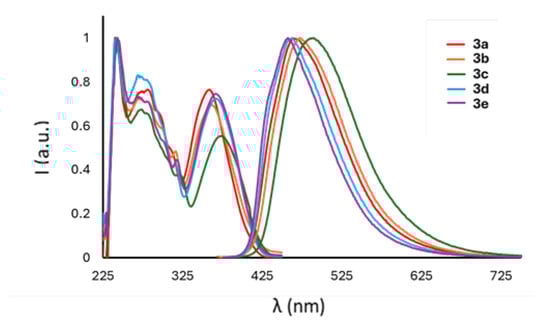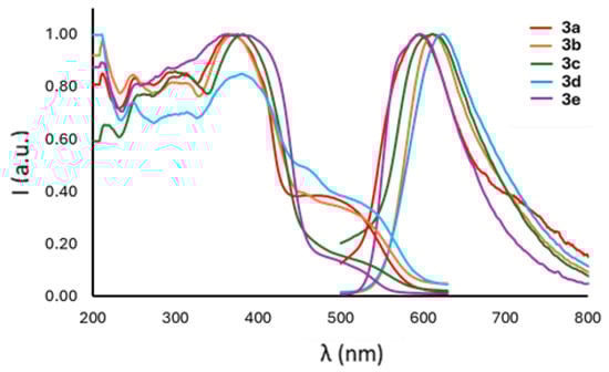 The absorption and emission spectra of compounds 3a–e in the solid state (powders) are collected in Figure 5.