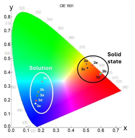 CIE 1931 chromaticity plot of compounds 3a–e emissions in solution and the solid state.