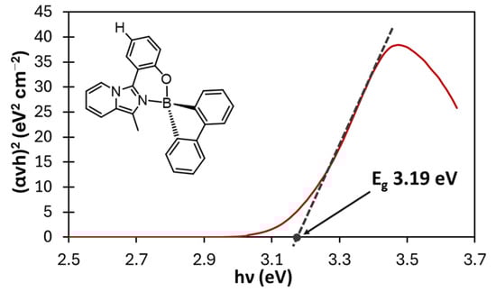 Tauc’s plot of compound 3a (CH2Cl2, 5 × 10−5 M) with the respective band gap energy estimation.