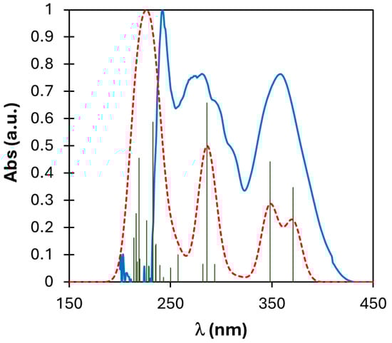 Experimental (solid blue line) and calculated (dashed red line) UV-vis spectra of compound 3a in dichloromethane solution. Green vertical lines represent the oscillator strength associated with the electronic transition.