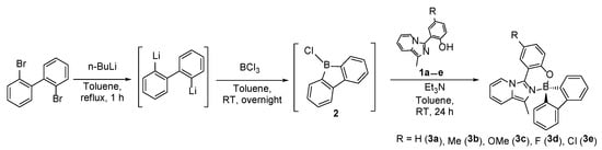 The imidazo[1,5-a]pyridine derivatives 1a–e were prepared following established procedures [39]. The synthesis of the spiro–boron compounds was accomplished through a modification of a one-pot three-steps procedure (Scheme 1) [45]. Initially, 9-chloro-9-borafluorene 2 was generated in situ by reacting 2,2′-dibromobiphenyl with n-butyllithium followed by reaction of the corresponding dilithium salt with boron trichloride. Subsequently, the resulting intermediate was reacted in situ with 1a–e to give 3a–e as orange to yellow solids, in good yields.