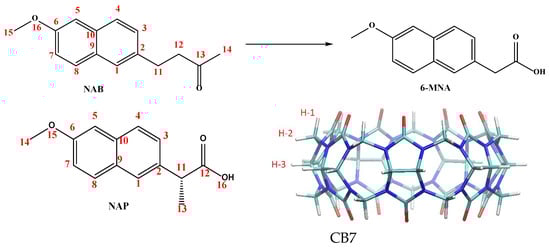 NSAIDs are widely used in clinical practice for the treatment of pain, inflammation, and fever. They also serve as valuable molecular systems in host–guest chemistry due to their diverse structures, amphiphilic character, and biologically relevant functionalities. In this study, we selected two structurally similar NSAIDs as guest molecules to investigate the host–guest interactions with CB7. The first molecule used as a guest, naproxen (NAP, Figure 1), is a long-known NSAID that is active in its administered form. The second, nabumetone (NAB, Figure 1), is a prodrug that generates the active molecule 6-methoxy-2-naphthylacetic acid (6-MNA, Figure 1) through metabolic reactions. Both drugs have been on the market for a long time but are still being researched today [18,19,20].