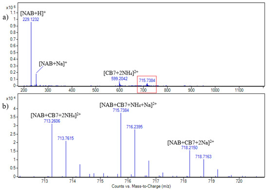 As can be seen, the signals assigned to the [CB7 + NAB + 2NH4]2+, [CB7 + NAB + NH4 + Na]2+, and [CB7 + NAB + 2Na]2+ doubly charged ions are at m/z values of 713.3, 715.7, and 718.2, respectively. The cucurbituril adducts with ammonia or alkali metal ions are usually observed in MS spectra, acquired both in positive and negative ion modes. The signals at m/z 229 and 251 (Figure 2) are assigned to the [NAB + H]+ and [NAB + Na]+ singly charged ions, respectively [19,20].