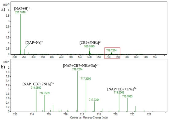 ESI + HRMS spectrum of nabumetone and CB7 solution in molar ratio 1:1. c (NAB) = 2.15 × 10−5 M (a); enhanced view of ion signals between m/z 712 and 720 (b).