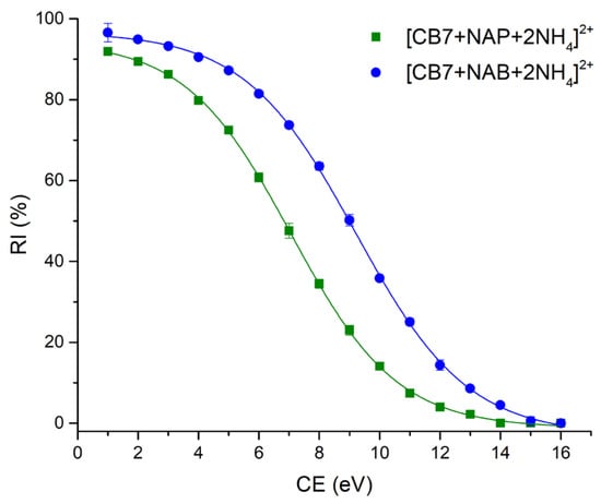 The relative intensities of complex molecular ions [CB7 + NAP + 2NH4]2+ (■) and [CB7 + NAB + 2NH4]2+ (●) as a function of the collision energy (CE). Error bars represent the standard deviation for the quadriplicate analyses.