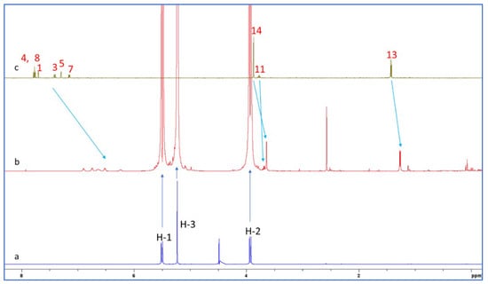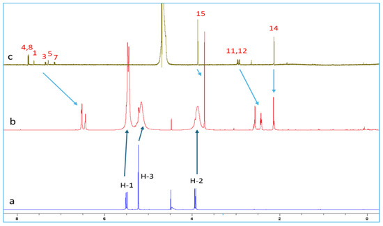 The proton chemical shifts of NAB-CB7 were assigned using the 1H-NMR technique and previously published research data [19,32,33]. Due to the low solubility of NAB and CB7 in water, only the 1H NMR spectra with the water suppression module were recorded for these molecules. A comparison of the spectrum of NAB (Figure 6c) with the proton spectrum of the NAB-CB7 1:1 complex (Figure 6b) shows that the solubility of the complexed NAB is much higher than that of the free form. An analysis of the 1H NMR spectra of NAB, CB7, and the NAB-CB7 complex showed a significant change in the chemical shift of NAB after complex formation, especially the aromatic NAB protons (Figure 6, Table 1). The upfield shift of these protons, as well as protons 11 and 12, suggested the inclusion of the whole NAB molecule inside the cavity, while the methyl groups (protons 14 and 15) are exposed to the bulk near the CB7 portals. These results are similar to those previously reported for the complexation of NAB with β–CDs [19].