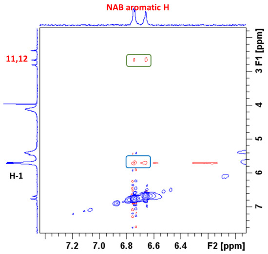 To better understand the intermolecular interactions between NAB and CB7 molecules in the complex, 2D ROESY experiments were performed. ROESY crosspeaks were assigned between the aromatic protons of NAB and the H-1 protons of CB7 (Figure 7), confirming the proximity between the two structural parts. Figure 7 shows a part of the NAB-CB7 spectrum, which shows both intermolecular (marked in blue) and intramolecular (marked in green) ROE contacts. The complete ROESY spectrum is shown in Figure S13.