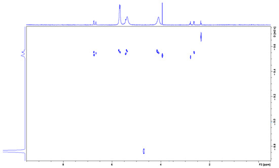 To confirm the formation of the NAB-CB7 complex, the DOSY 1H NMR spectra of the NAB-CB7 solution were also recorded. As shown in Figure 8, different diffusion coefficients were detected in the DOSY NMR spectra, indicating the presence of different components in the solution, including the NAB-CB7 complex (D = 2.66 × 10−10 m2/s), non-associated CB7 (D = 2.72 × 10−10 m2/s), and non-associated NAB (D = 3.24 × 10−10 m2/s), respectively. The small difference in the diffusion coefficients between CB7 and the complex is a consequence of the small size difference between the two compounds.