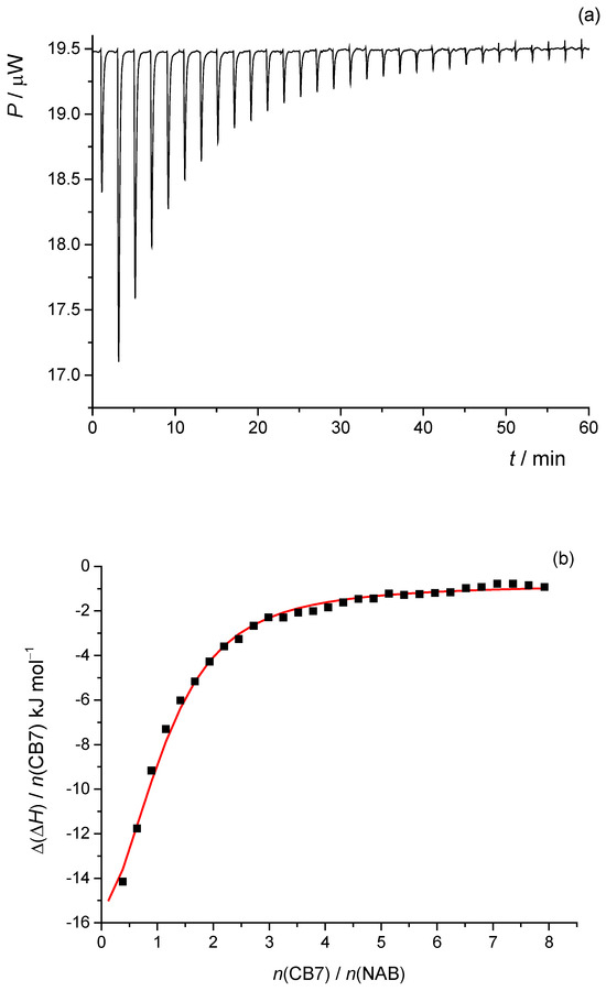 To investigate the complexation reaction between NAB and CB7, isothermal microcalorimetric titrations were performed in pure water at 25 °C (Figure 10a). The normalized successive enthalpy changes with respect to the molar ratio CB7/NAB (Figure 10b) were consistent with the formation of a 1:1 complex. By processing the calorimetric data accordingly, the standard thermodynamic parameters of the complexation reaction (reaction enthalpy, entropy, and Gibbs free energy) and the corresponding equilibrium constant were determined (Table 3).