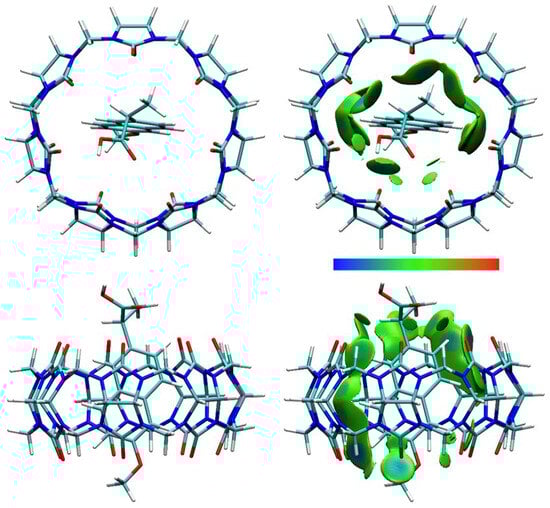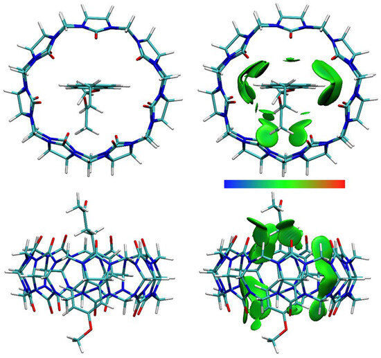 Computational chemistry methods are a valuable tool for identifying and characterizing dominant binding interactions during the inclusion of non-polar molecules into the hydrophobic cavity of a host molecule. In aqueous solution, the contributions to inclusion come from electrostatic interactions, hydrogen bonding, dispersion interactions, and hydrophobic effects. Computational methods have been developed, with which these very weak interactions can be investigated [40]. Among others, the independent gradient model, based on the Hirshfeld partition of a molecular density (IGMH) analysis, has proven to be a useful visual method for the detection of intermolecular, noncovalent interactions [40,41]. In an IGMH analysis, the density gradient difference (δginter) isosurfaces are colored with sign(λ2)ρ values to visually illustrate weak attractive interactions, such as hydrogen bonds, van der Waals interactions, and weak repulsive steric interactions [41].