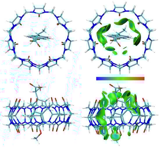 The calculations were performed using GAUSSIAN 16 software [50] at the B3LYP/6-311+G (2d,2p) level [51,52] with the D3 version of Grimme’s empirical dispersion correction [53]. Non-specific solvent effects were evaluated using the polarizable continuum model (PCM) of the self-consistent reaction field (SCRF) method [54] with water as a solvent. The geometry optimization of the host–guest system conformers was performed, and the obtained stationary points were confirmed as minima by a vibrational analysis at the same theoretical level. An independent gradient model based on the Hirshfeld partition of molecular density (IGMH) analysis [41] and the atoms-in-molecules (AIM) topological analysis [55] were performed on the obtained wave functions of the host–guest system with the MULTIWFN 3.8 program [56,57] and plotted with the VMD 1.9.4 program [58].