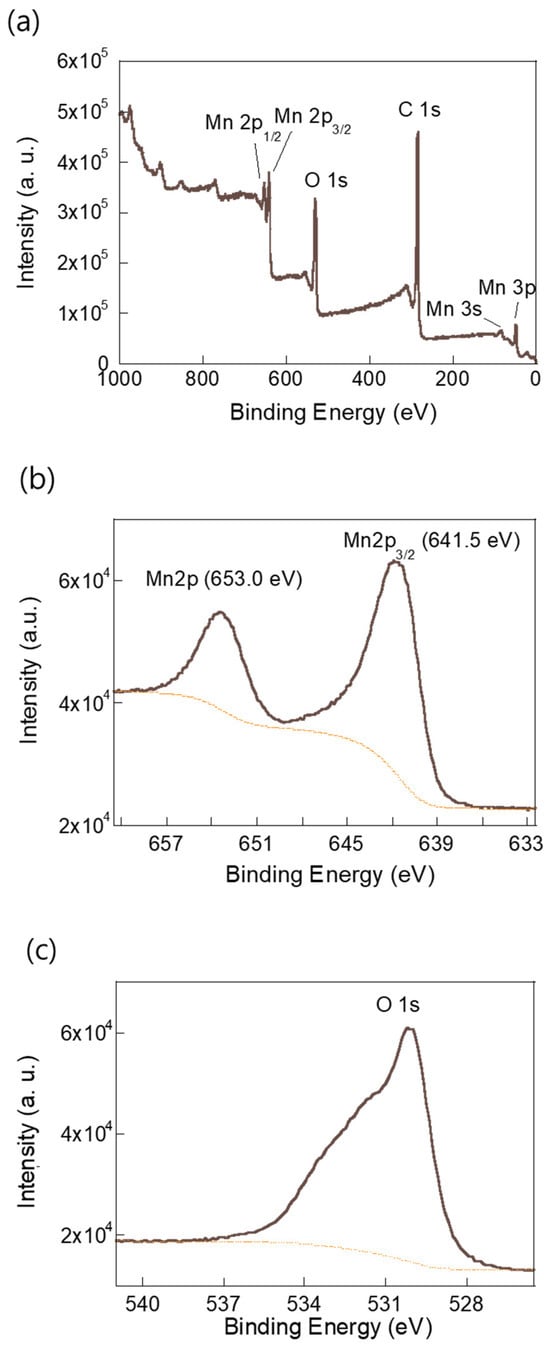 (a) X-ray photoelectron spectroscopy (XPS) survey spectrum of the MnO film. (b) High-resolution Mn 2p and (c) O 1s spectra confirming the Mn and oxygen chemical states.