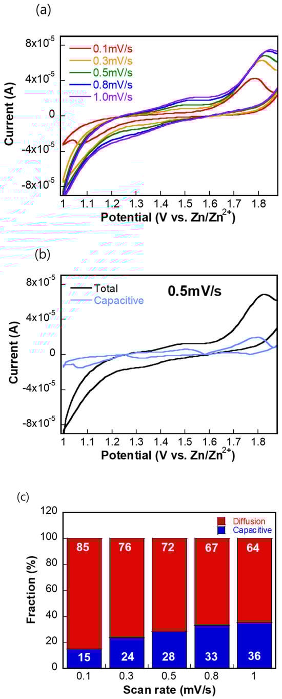 To quantify the capacitive contribution, the total current at a given potential i(V) was deconvoluted into capacitive and diffusion-controlled components using the equation [19,20] i(V) = k1v + k2v1/2, where k1v represents the capacitive contribution and k2v1/2 corresponds to diffusion-limited processes. Figure 4b shows the result of this analysis at a scan rate of 0.5 mV s−1, where the capacitive current (blue) is overlaid on the total current (black). The significant overlap at high potentials suggests that capacitive storage dominates in these regions.