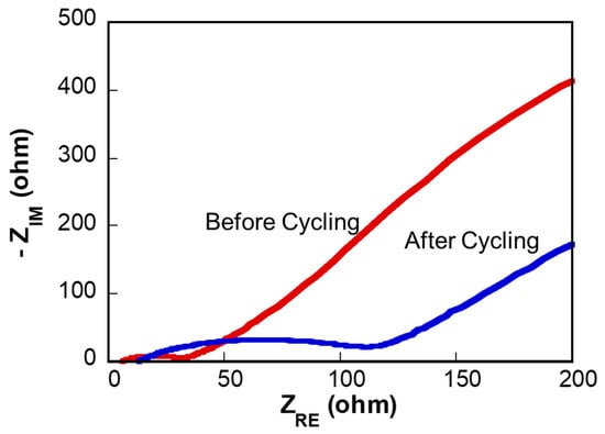 EIS analysis revealed changes in charge transfer resistance and diffusion behavior upon cycling, as shown in Figure 6. Before cycling (red curve), the charge transfer resistance was relatively low at approximately 26 Ω, and the diffusion coefficient calculated from the Warburg region was 2.5 × 10−10 cm2/s. However, after cycling (blue curve), the charge transfer resistance significantly increased to about 102 Ω, yet the diffusion coefficient improved notably to 9.8 × 10−10 cm2/s. These results suggest cycling-induced structural modifications at the electrode/electrolyte interface, which increased resistance while simultaneously enhancing ionic diffusivity within the electrode material.
